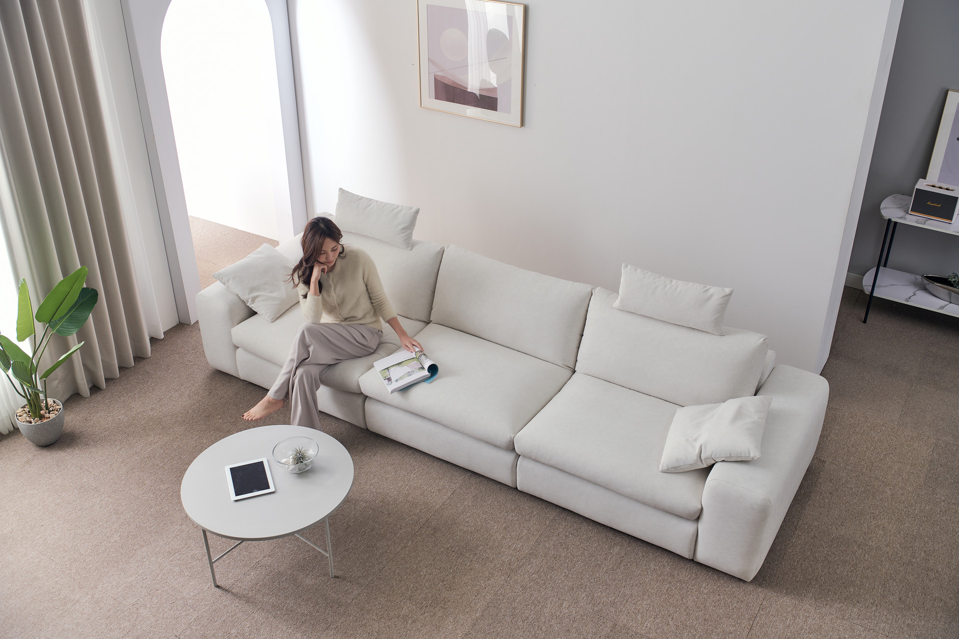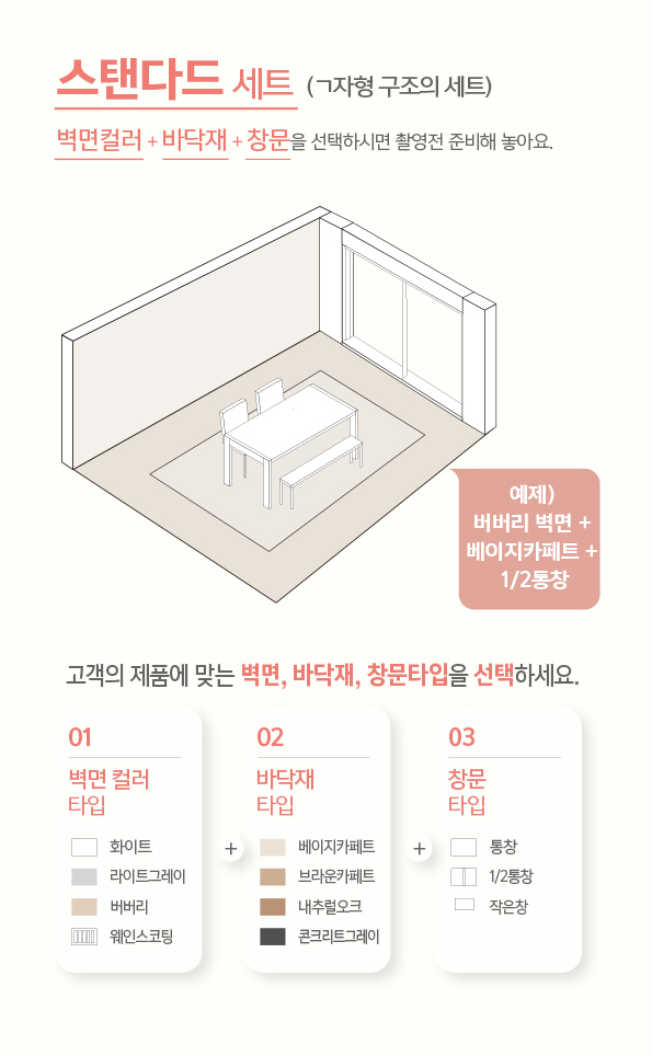 ㄱ자형 공간연출로제품을 직관적으로 꾸밈없이 표현할 수 있어요귀사의 제품과 레퍼런스에 적합한 공간에서다양한 아이템과 소품가구, 오브제등을 더해 코지하면서 내추럴한 분위기를또는, 깔끔하면서 미니멀한 공간을연출해 드려요.